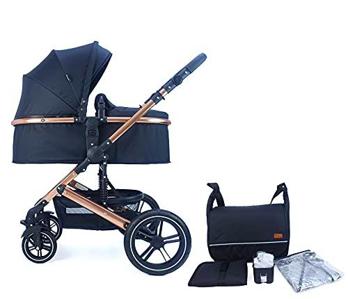 Cochecito de bebé con capazo de tela, bolso cambiador, soporte para bebidas, lona impermeable, mosquitera, cambiador (dorado/negro)